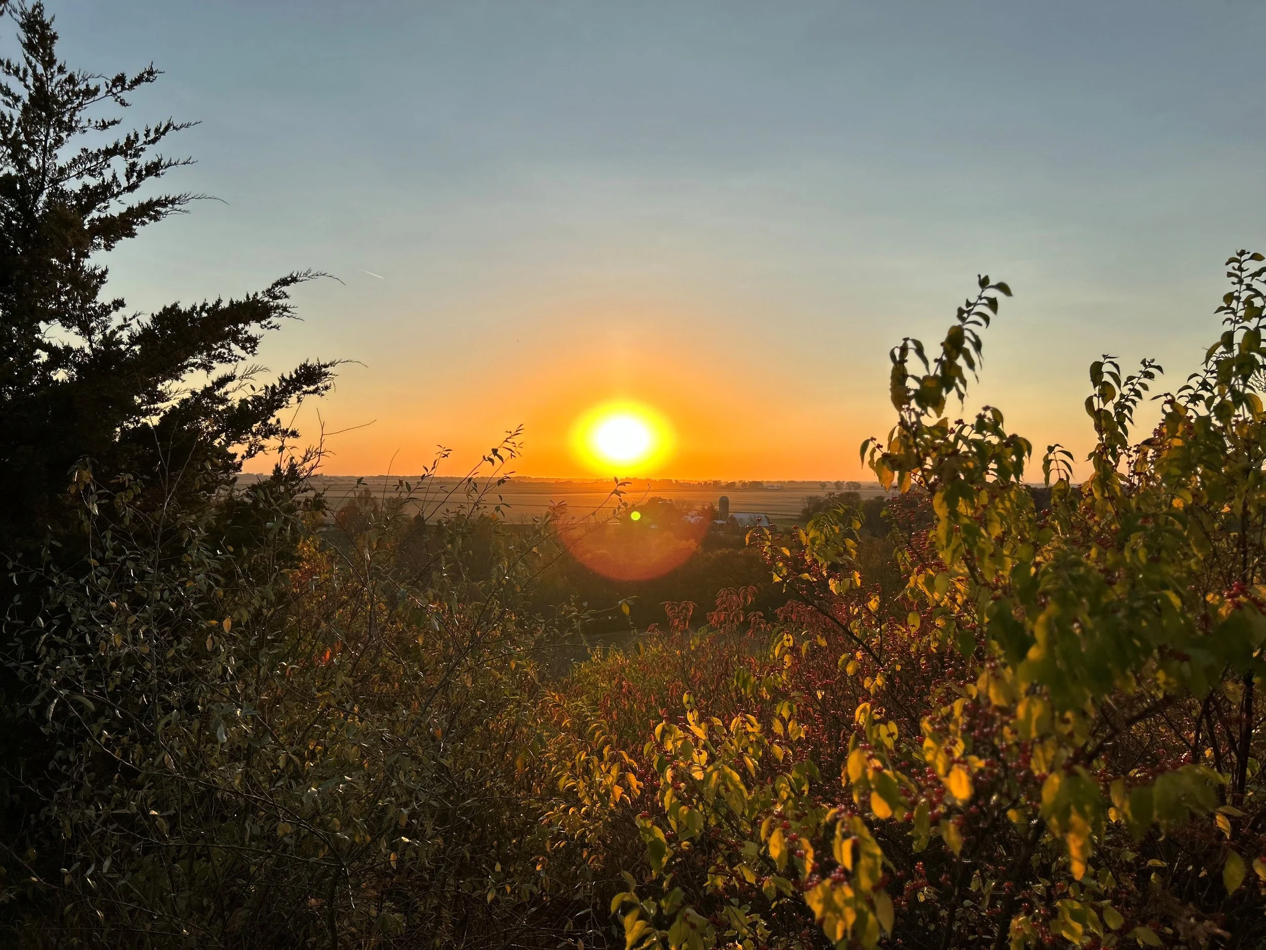 Alt Text: Warm sunset over trees with berries taken by Dr. Leonard near their hometown.